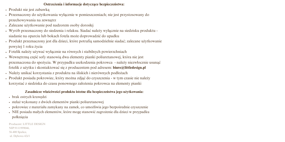 W naszych fotelikach stawiamy przede wszystkim na wygodę i funkcjonalność. Dlatego każdy model posiada zdejmowany pokrowiec, który w razie potrzeby można szybko wyprać i odświeżyć - idealnie przy dzieciach! Ze względu na to, że pokrowiec nie jest na stałe naciągnięty jak w tradycyjnych meblach tapicerowanych, materiał "pracuje" razem z pianką i może miejscami układać się z drobnymi marszczeniami. To całkowicie naturalne i typowe dla fotelików z miękką konstrukcją, a jednocześnie sprawia, że korzystanie z nich jest maksymalnie praktyczne.